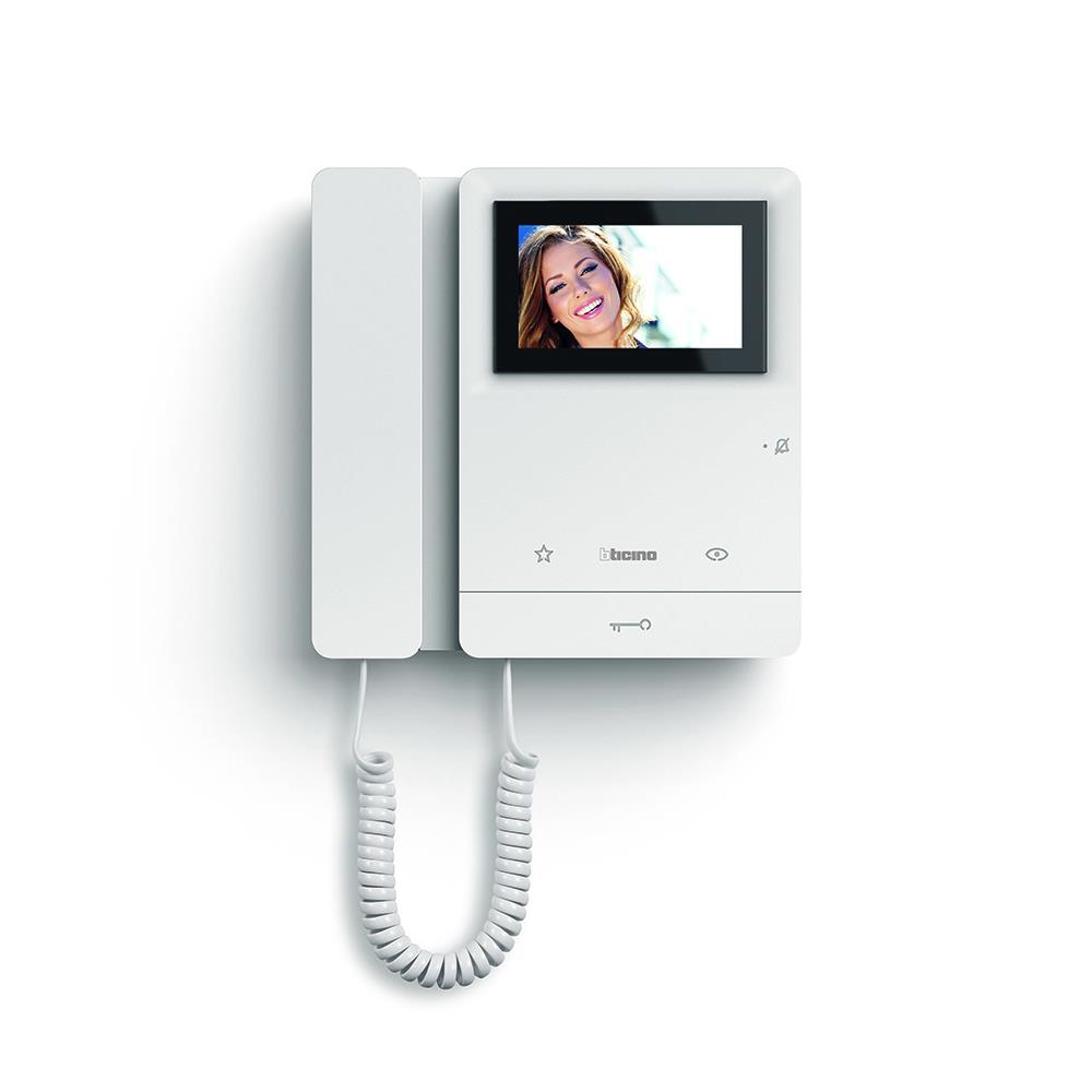 2-проводно видео вътрешно устройство със слушалка и 4,3" цветен LCD дисплей, подходящо за монтаж на стена (включена опора за скоба). Устройството има три сензорни клавиша, които позволяват: освобождаване на ключалката на вратата, активиране/превъртане на камерата на входния панел и персонализиране на спомагателна функция – например допълнително активиране на заключване на вратата, допълнително активиране на камера Странично лесно достъпни и независими регулации за: сила на звука на повикване / изключване на мелодия (с LED за известяване) и цвят, яркост и контраст на дисплея Слушалката има магнити за лесно държане.