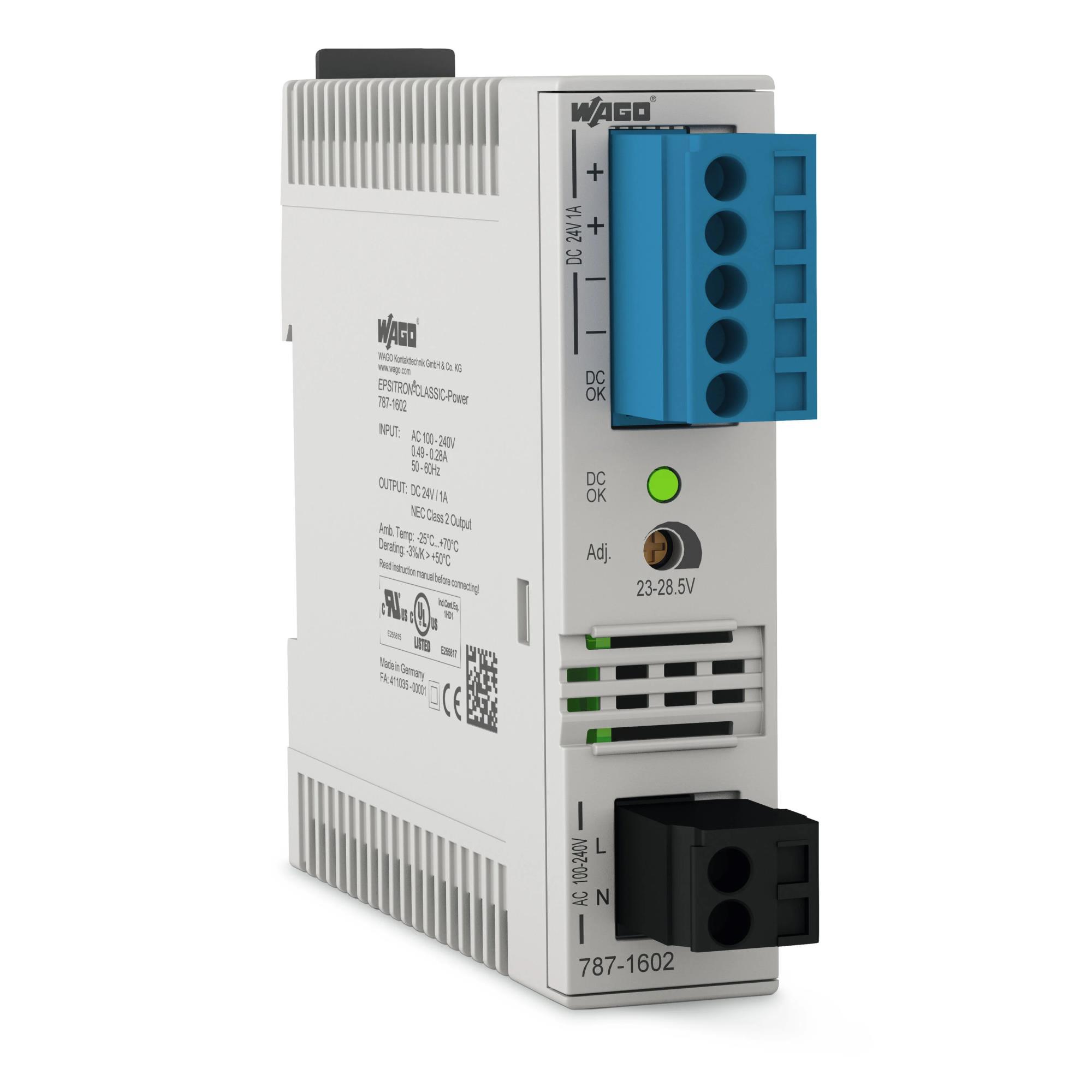 787-1602 Wago Имп.захр. CLASSIC,1x100-240VAC/24VDC-1A,2.5 mm²,DIN,DC OK LED и сигн.(22.5x107.5х90mm)